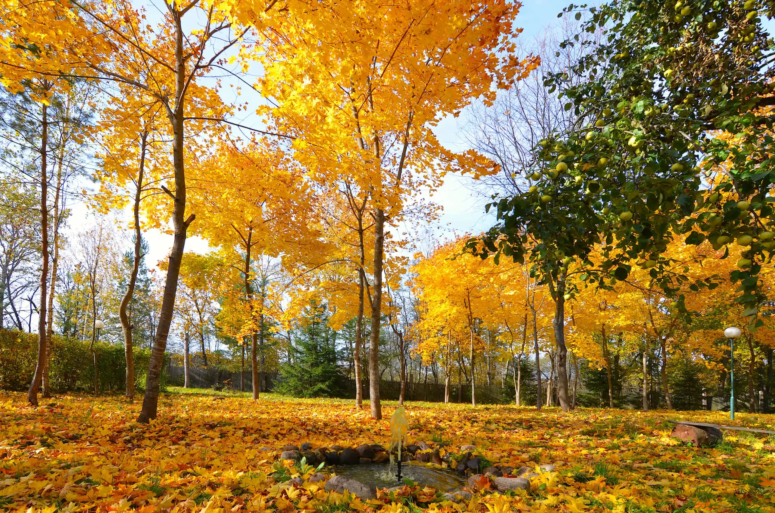 Акварели Осень День Фруктовый сад Клены Прудик_23