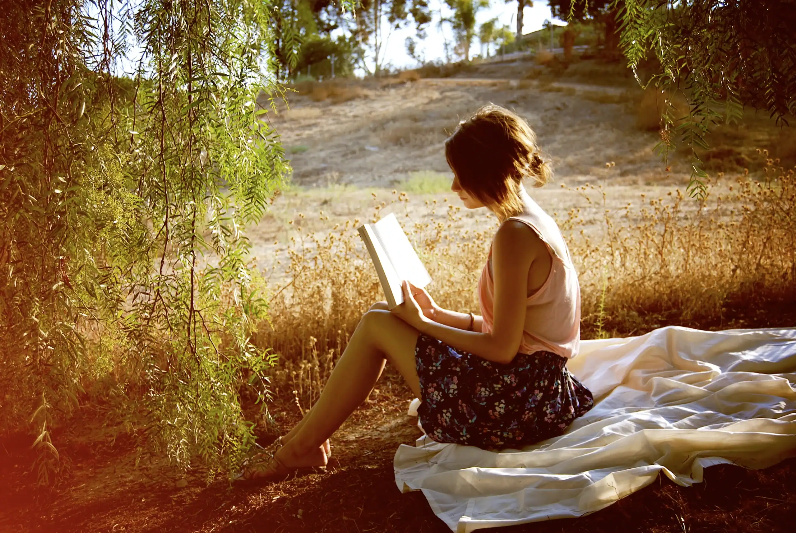 На изображении изображена молодая женщина, сидящая на белой ткани под ветвями деревьев и читающая книгу, наслаждаясь летом и природой в Подмосковье в районе арт-отеля.