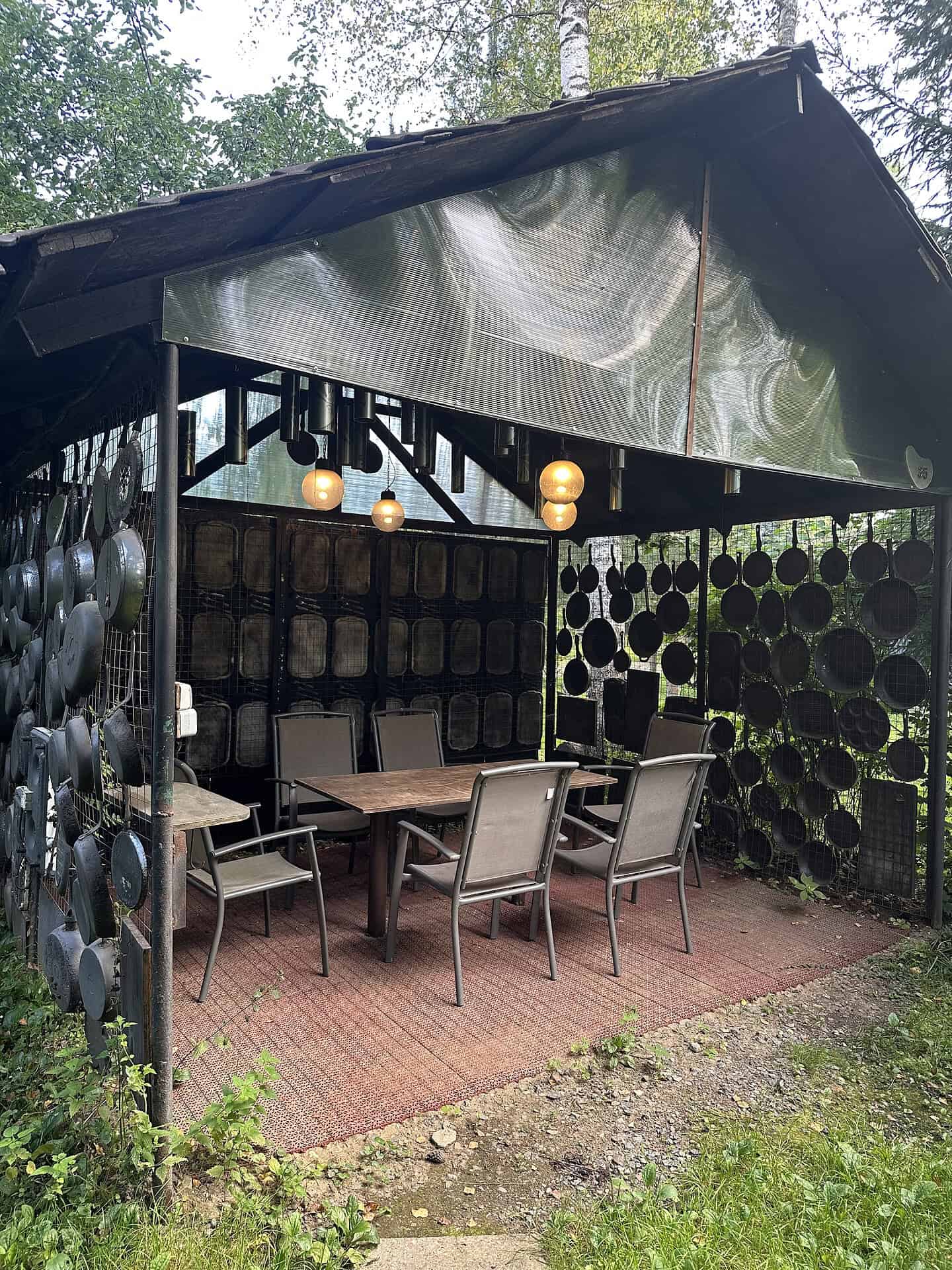 Уютная открытая беседка с деревянным столом и пятью креслами среди зелени, украшенная светильниками и металлическими тарелками на стенах, создает атмосферу отдыха и уединения на природе.