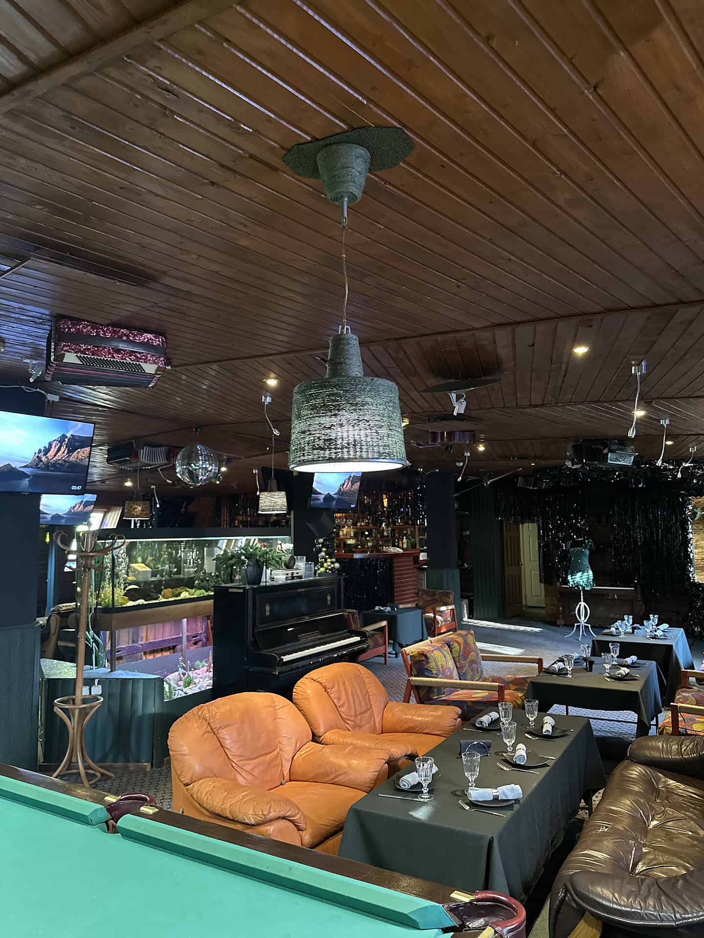 Интерьер ресторана в VE Art Resort в Подмосковье с мягкими креслами, столами, украшенными скатертями и посудой, а также декоративными элементами, создающими уютную атмосферу для отдыха и общения гостей.