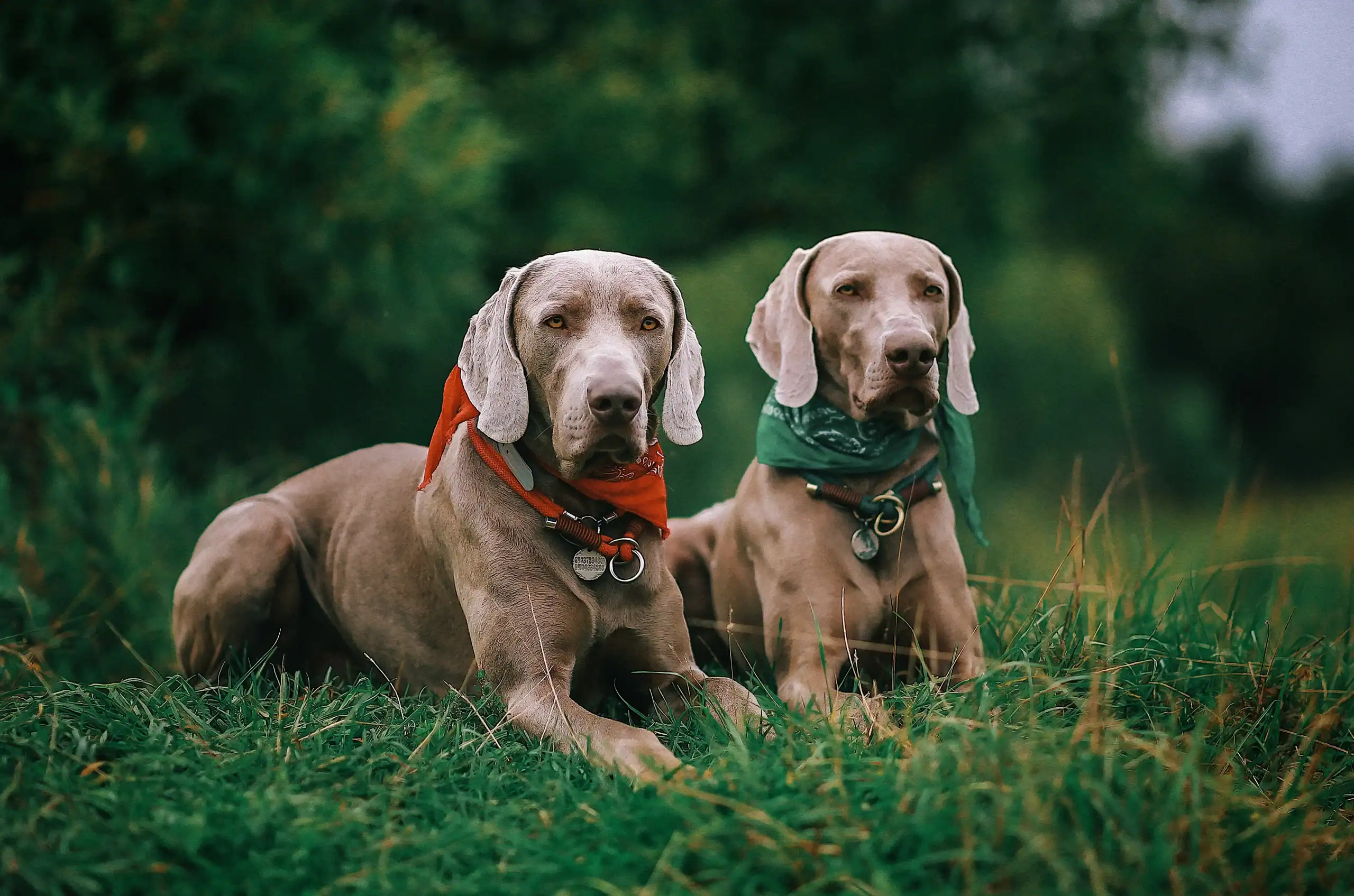 4. Краткое описание изображения: На изображении две добермана, пылящиеся на траве в окружении леса. Они одеты в банданы и ошейники, выглядят бдительными и расслабленными, создавая ощущение гармонии и природной красоты.