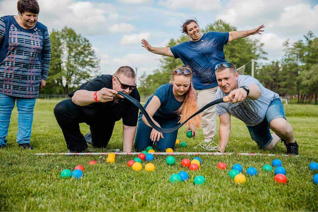 Группа людей на природе участвует в активной командной игре с цветными мячами, наслаждаясь солнечной погодой и свежим воздухом. Это изображение отлично передает атмосферу отдыха и развлечений в ВЕ Art Resort, подчеркивая его возможности для активного и приятного времяпрепровождения в Подмосковье.