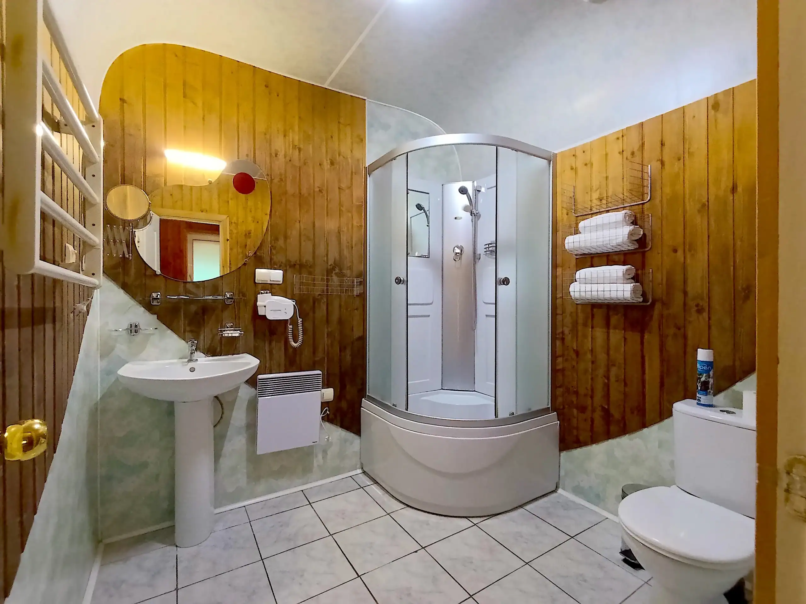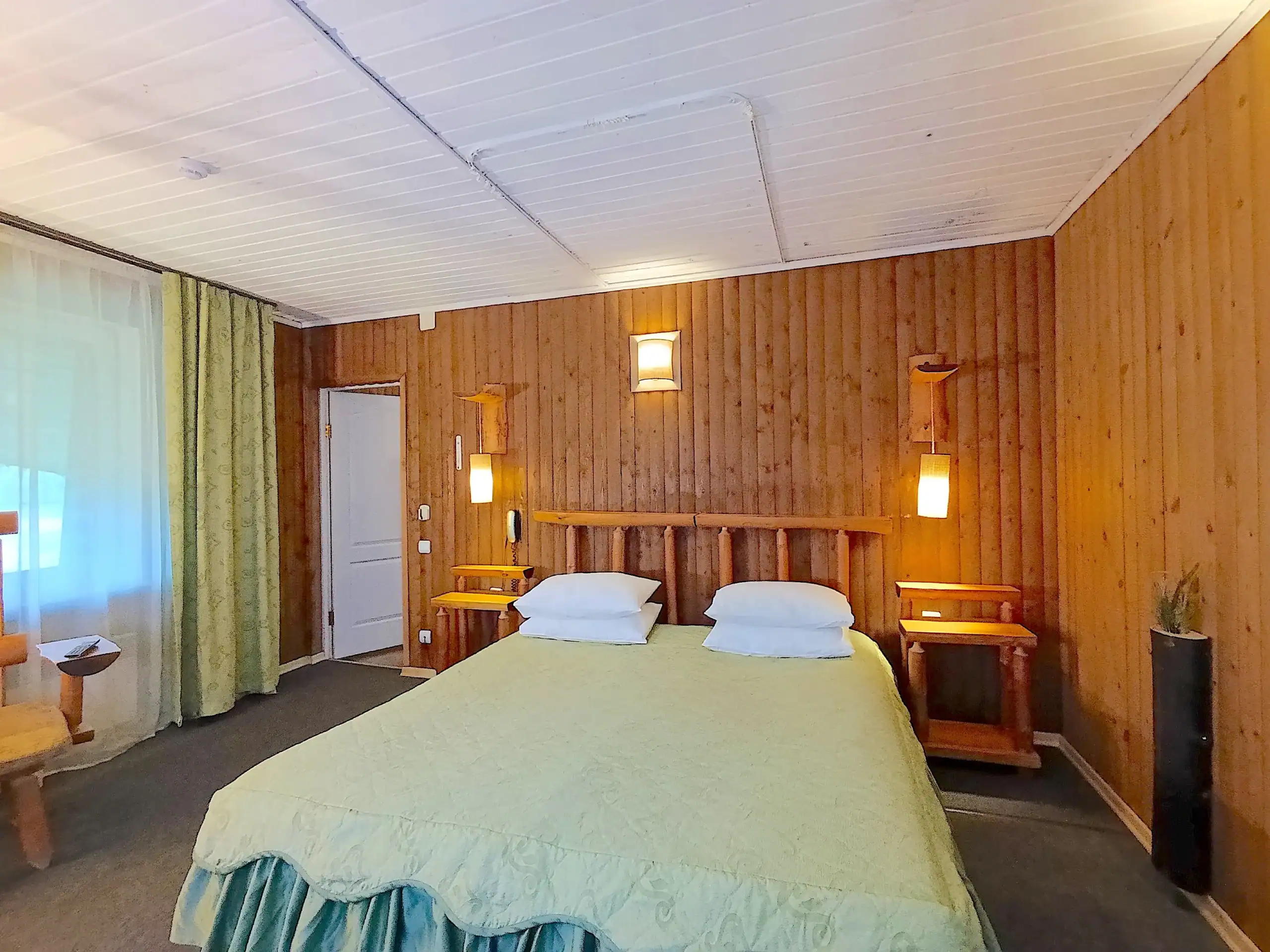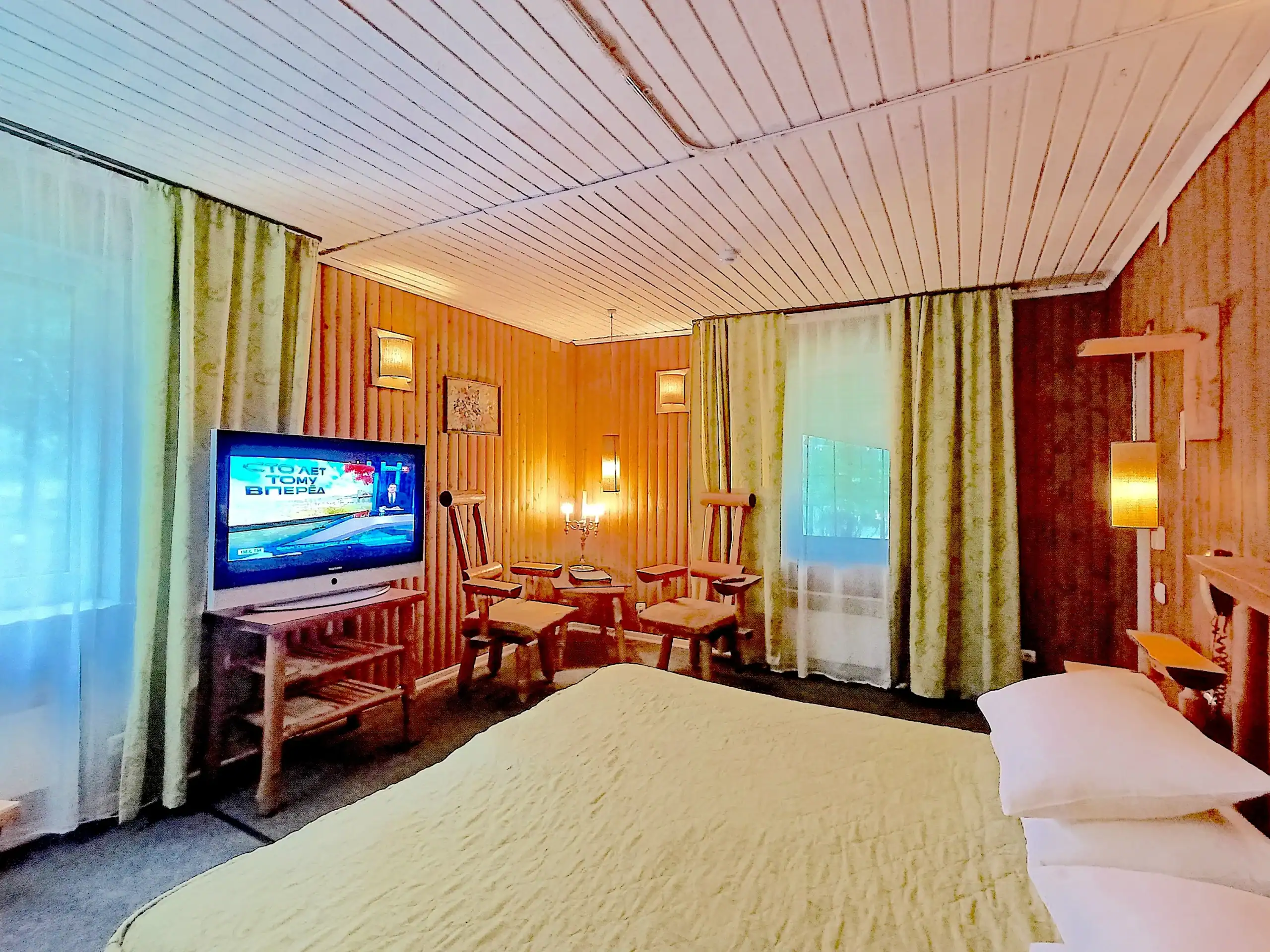 1-комнатный отдельно стоящий коттедж площадью 45 кв.м. Внешне стилизован под падающий дом, внутри оригинальный дизайн в «деревенском» стиле. Раздельные кровати под общим наматрасником. Имеет крытое патио.