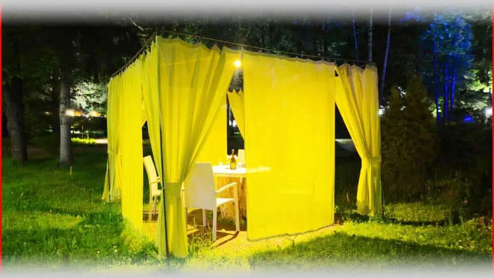 Изображение уличной зоны отдыха в парке с яркими желтыми шторами, столом и креслами, идеально подходит для отдыха и романтических встреч на природе рядом с ВЕ Art Resort, Подмосковье.