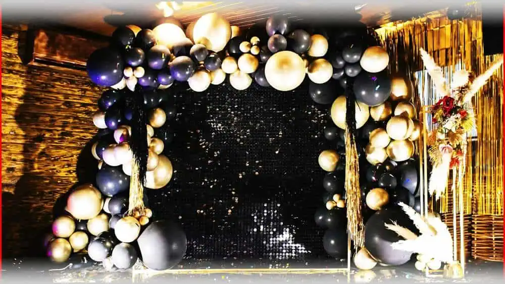 балансировка из черных, белых и золотых воздушных шаров для фотозоны, праздничное оформление, темное заднее освещение, украшение мероприятия, стильный декор, корпоративный или частный праздник.