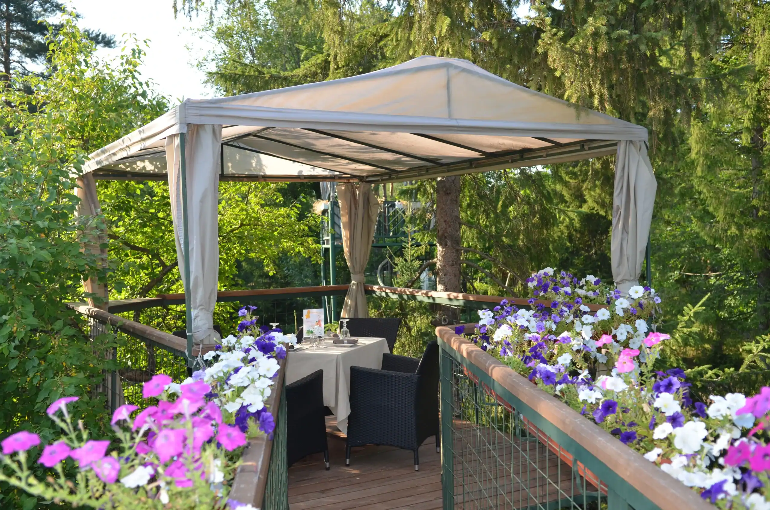 На фото изображена уютная беседка с столом на террасе ВЕ Art Resort, окруженная зеленью и цветами, создающая атмосферу спокойствия и комфорта для гостей.